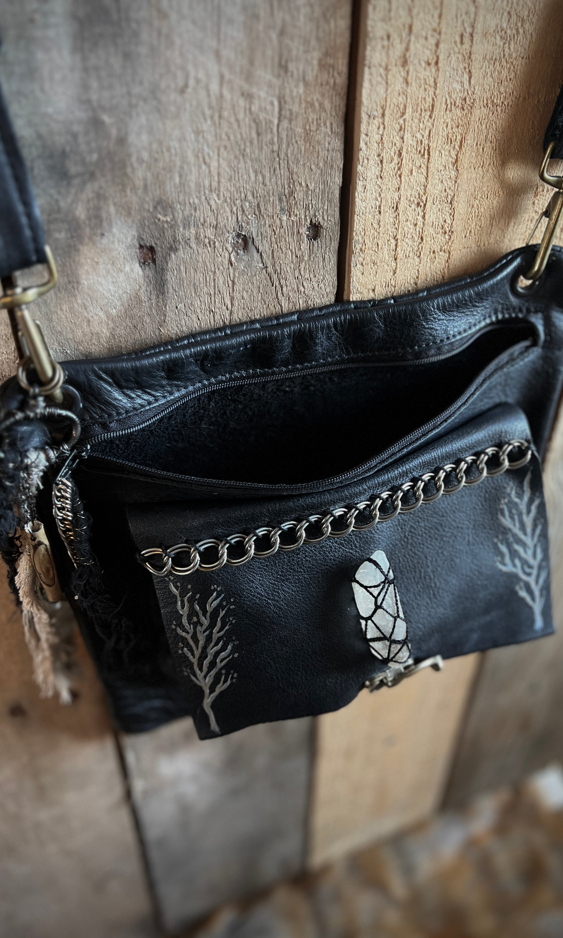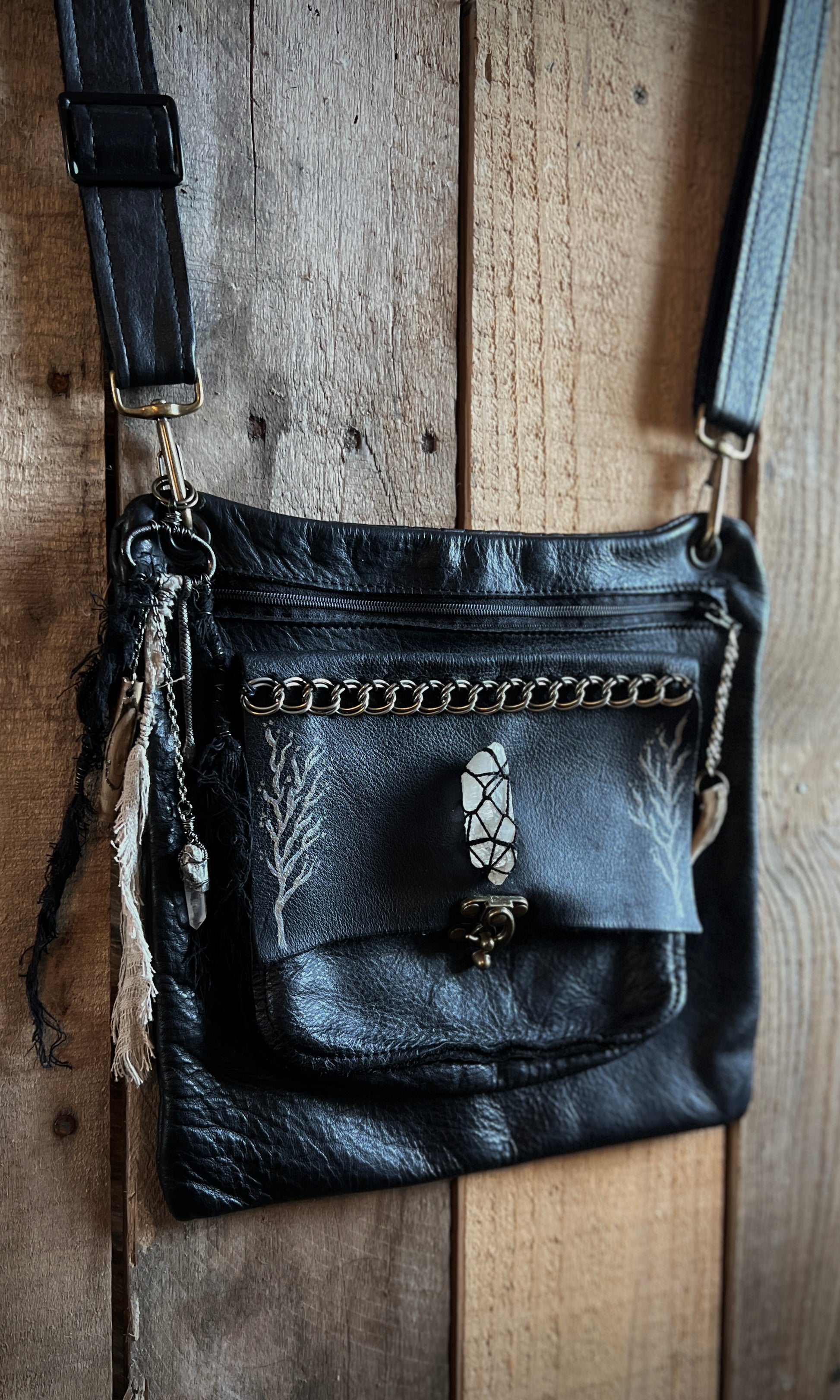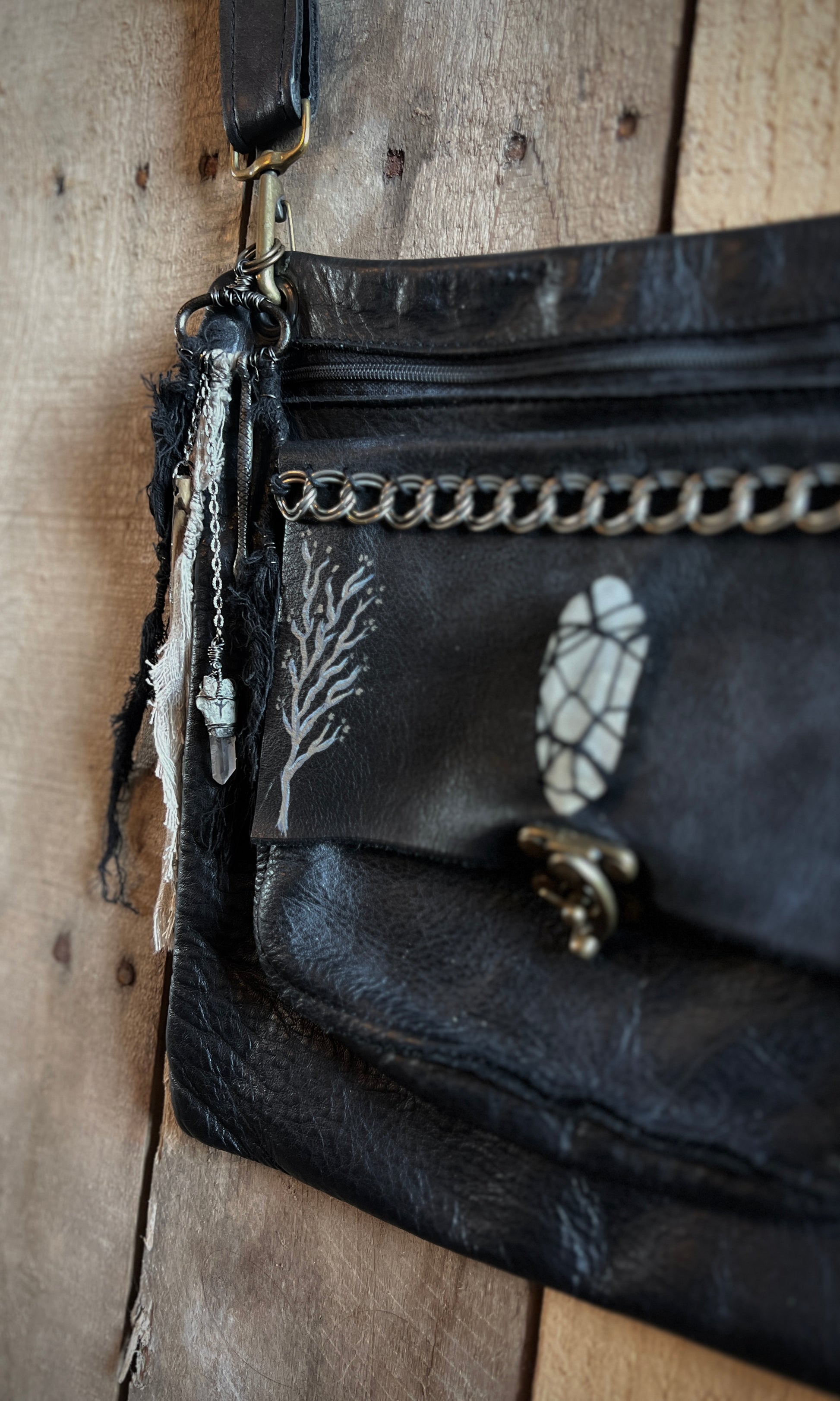 One of a kind upcycled black leather bag with hand sewn quartz crystals and chain, hand painted branches, antler zipper pull and crystal/bone/fabric accents. Approximately 10" x 10"