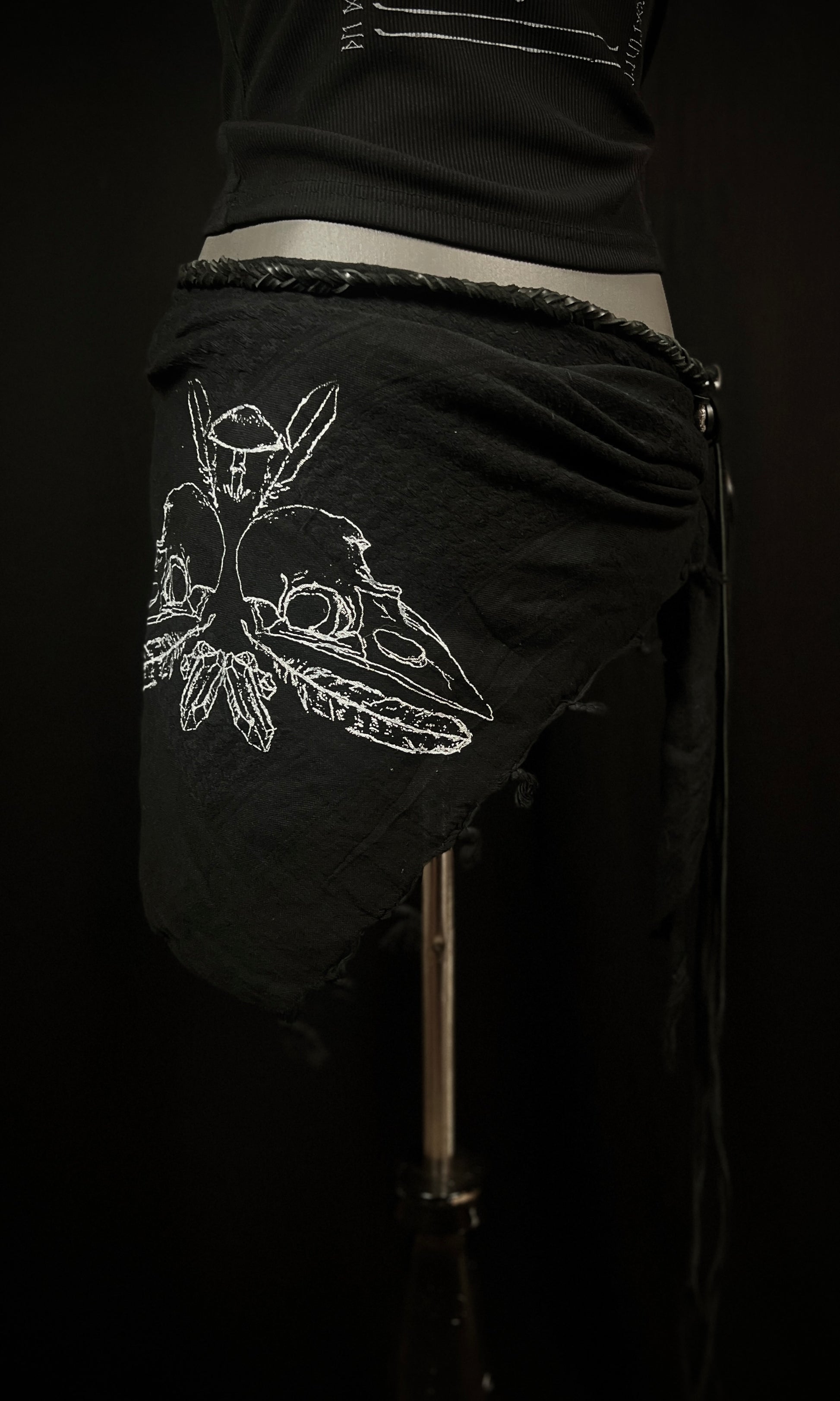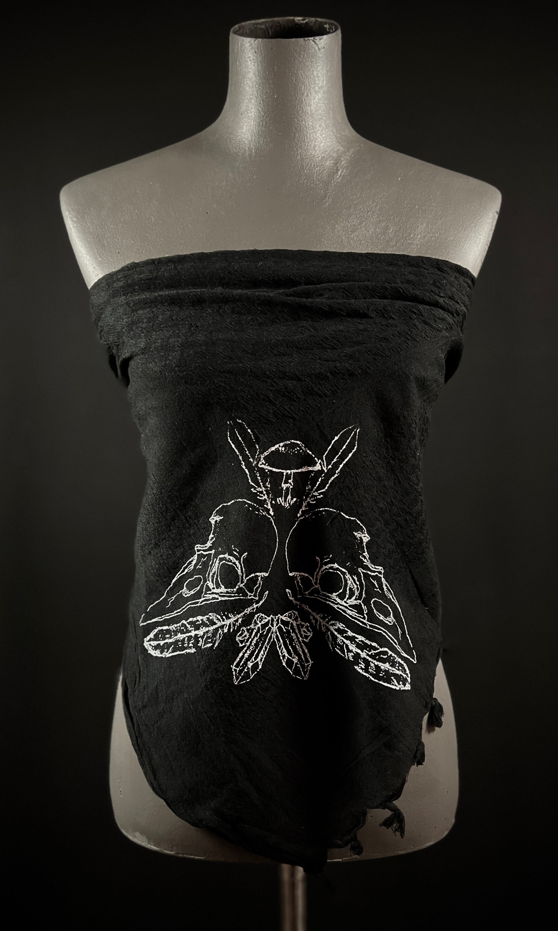 The design was drawn by me. It features two wolf skulls and ferns surrounding the dagaz rune made from bones. Printed on one edge of the scarf. Scarf is lightweight, has great texture. Raw edges. Originally a square scarf, but was too bulky so it has been cut in half and is now a triangle. Has tassels on one edge.