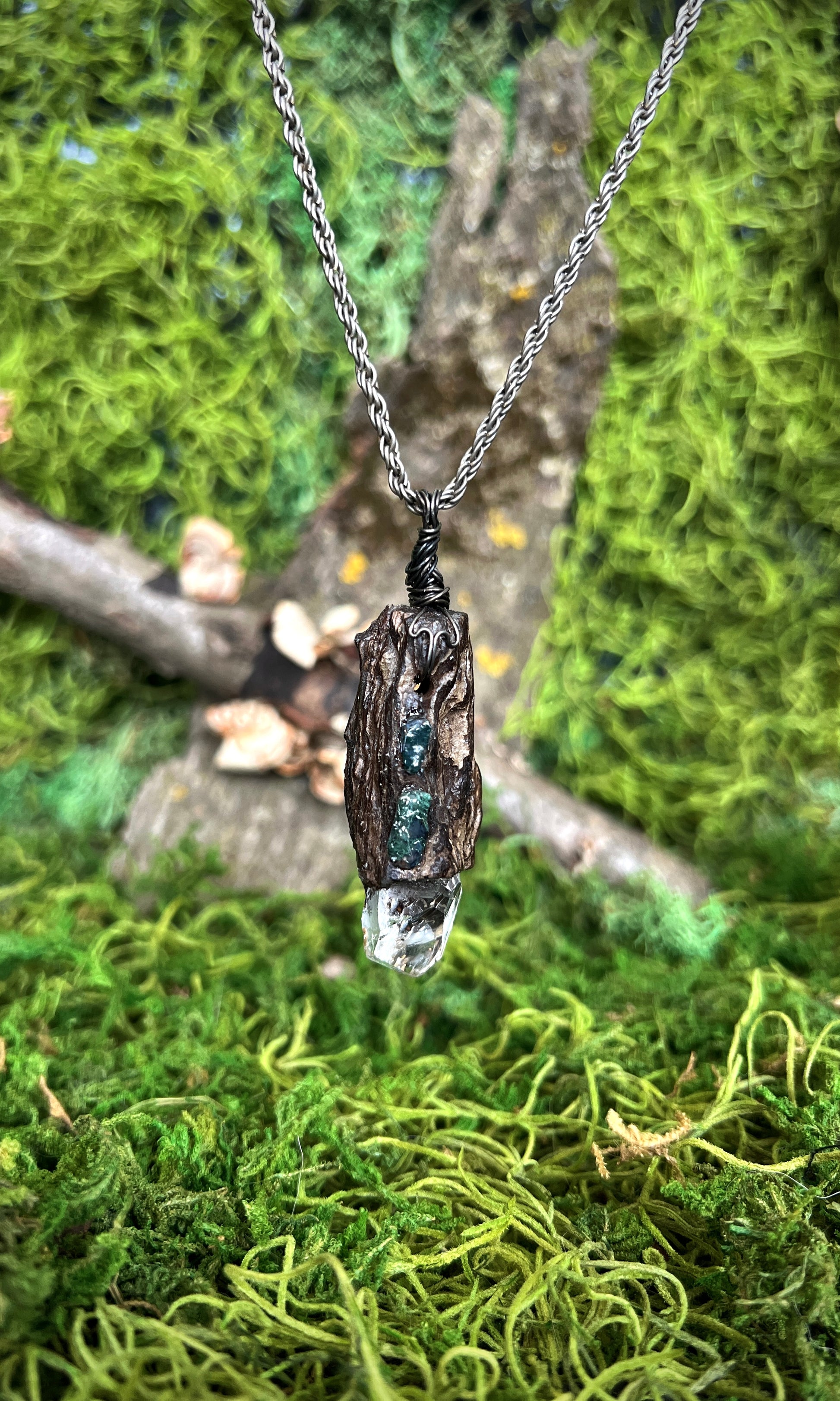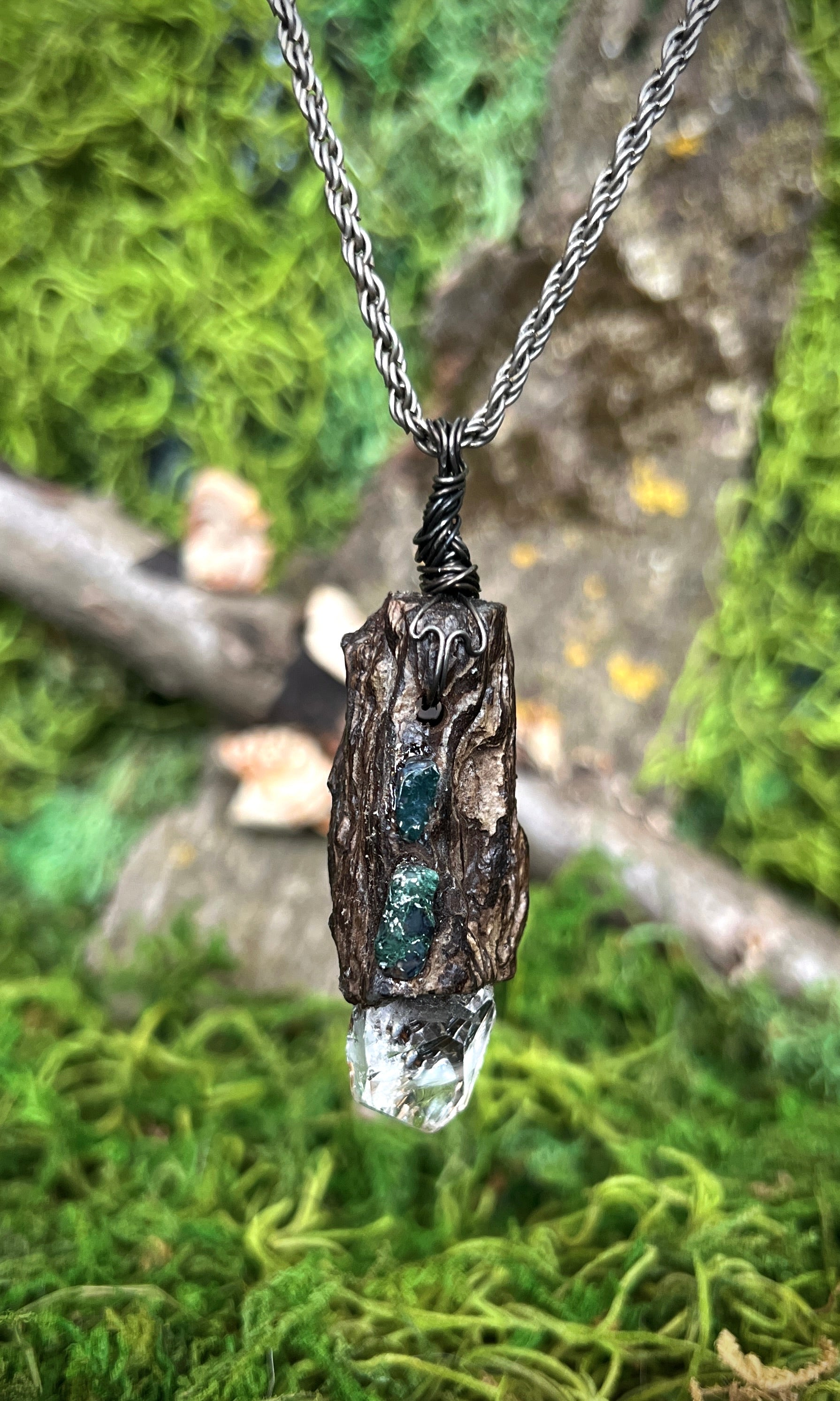 Handmade from found Wisconsin driftwood, herkimer diamond, and moss agate. Vintage chain.