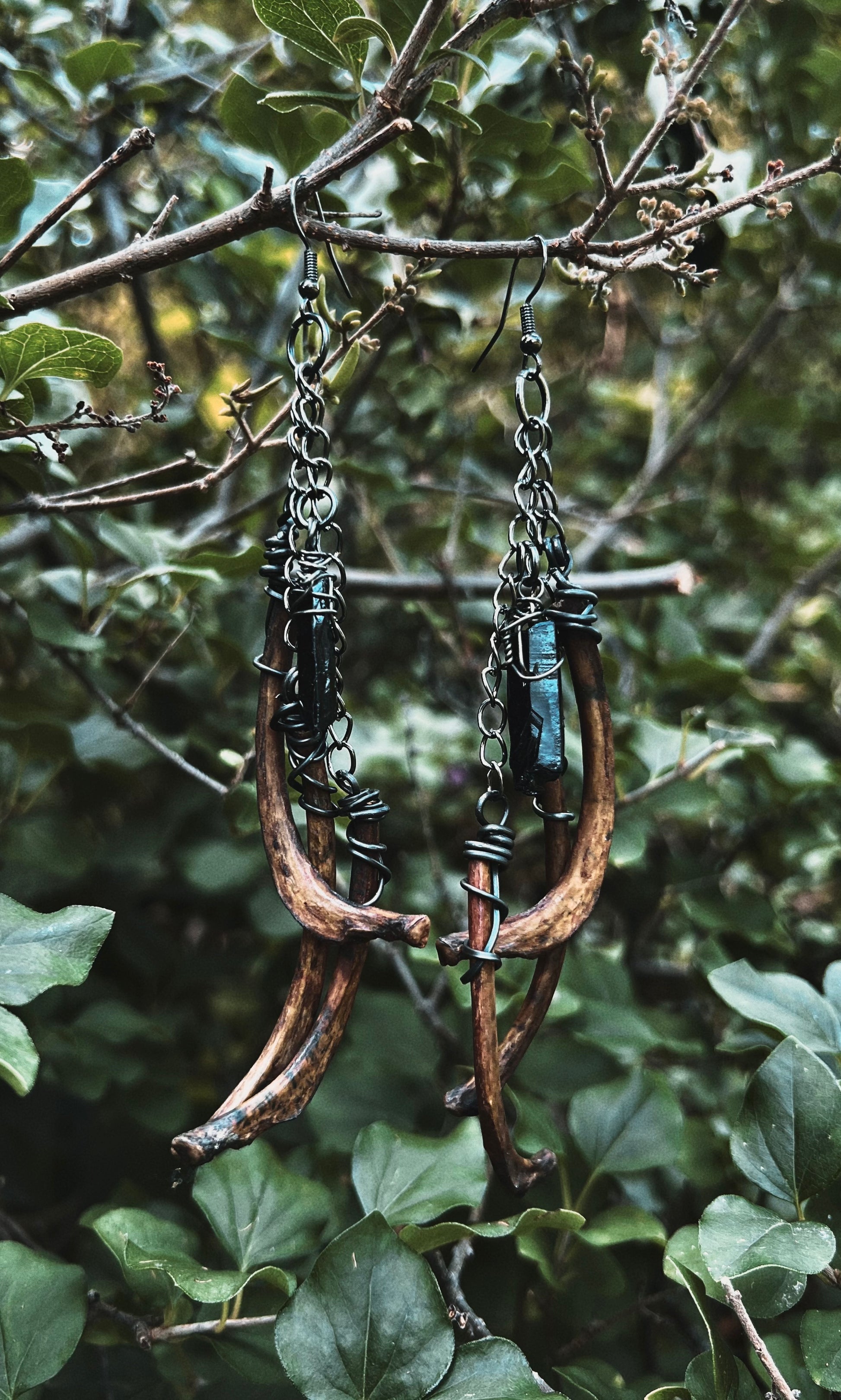OOAK TEA DYED DOUBLE RIB BONE & BLACK QUARTZ EARRINGS